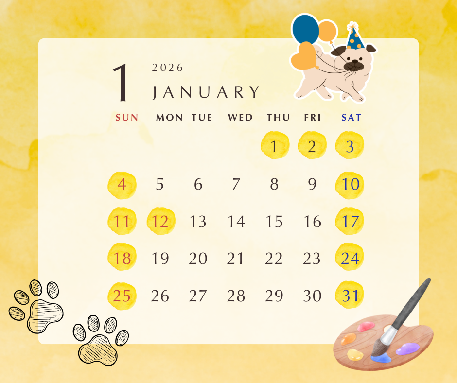 新年あけましておめでとうございます!いつもご愛顧いただき、誠にありがとうございます。1月の休営業日のお知らせです。大切なオーダーの絵やオリジナル作品の制作を進めてまいります。