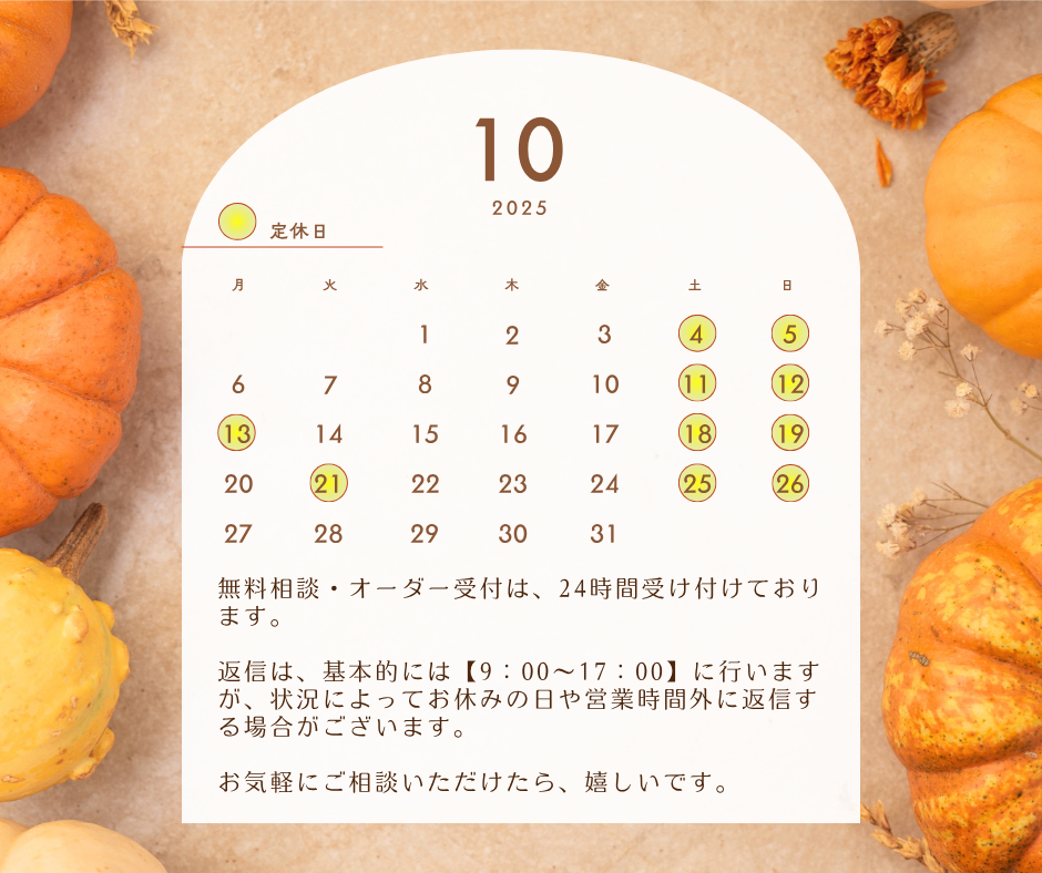 いつもご愛顧いただき、誠にありがとうございます。10月の休営業日のお知らせです。大切なオーダーの絵やオリジナル作品の制作を進めてまいります。